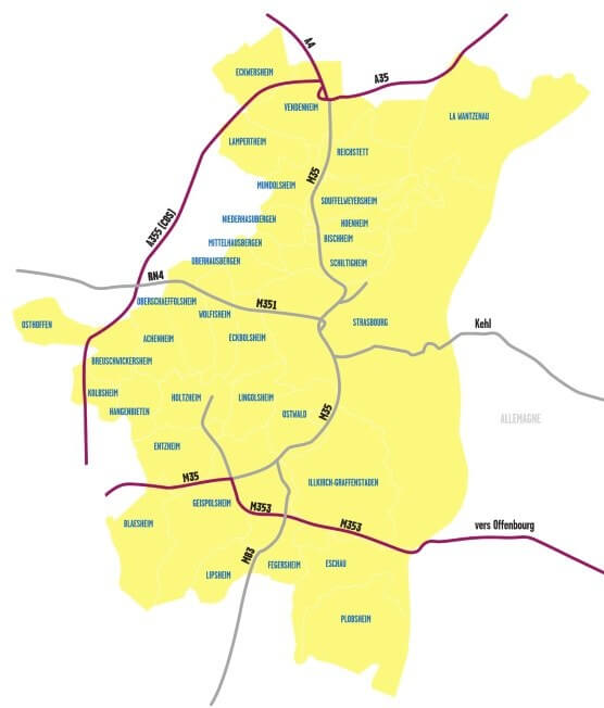 Strasbourgin vähäpäästöinen vyöhyke kattaa kaikki alueen 33 kuntaa. Rajoitukset eivät ole käytössä maantieväleillä A4, A35, N83, N353 ja D1083.